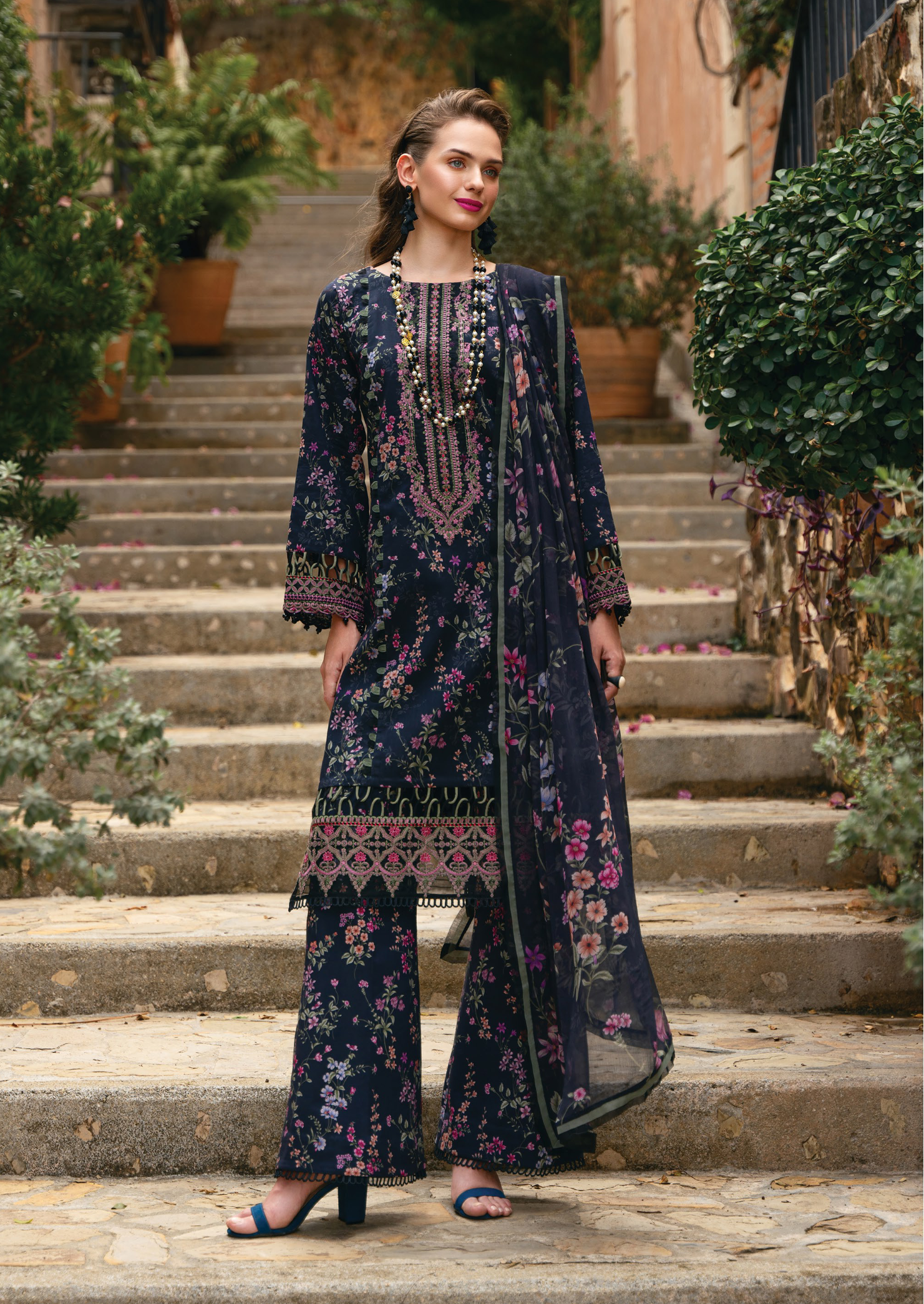 Black Gulaal Lawn 2024 Volume 2: Digital printed lawn shirt and chiffon dupatta with cotton trouser. Also Embroidery design organza border on neckline, front portion, sleeves and trouser.