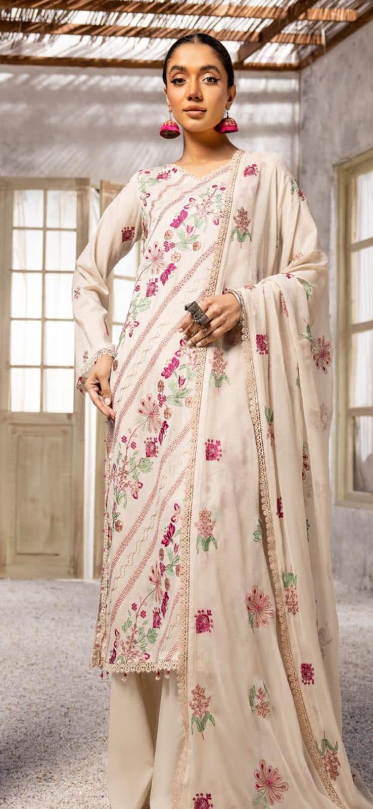 Cream White Khoobsurat Exclusive Lawn with full body embroidery designs and Chiffon Orna