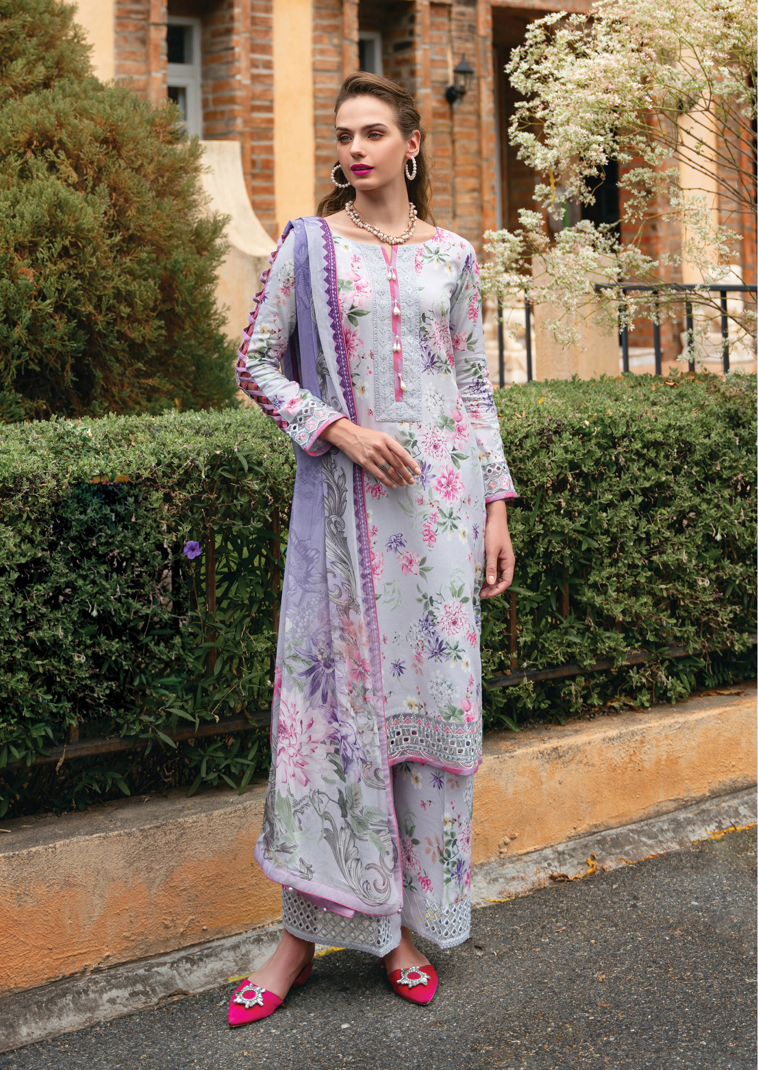 Light lavender Gulaal Lawn 2024 Volume 2: Digital printed lawn shirt and chiffon dupatta with cotton trouser. Also Embroidery design organza border on neckline, front portion, sleeves and trouser.