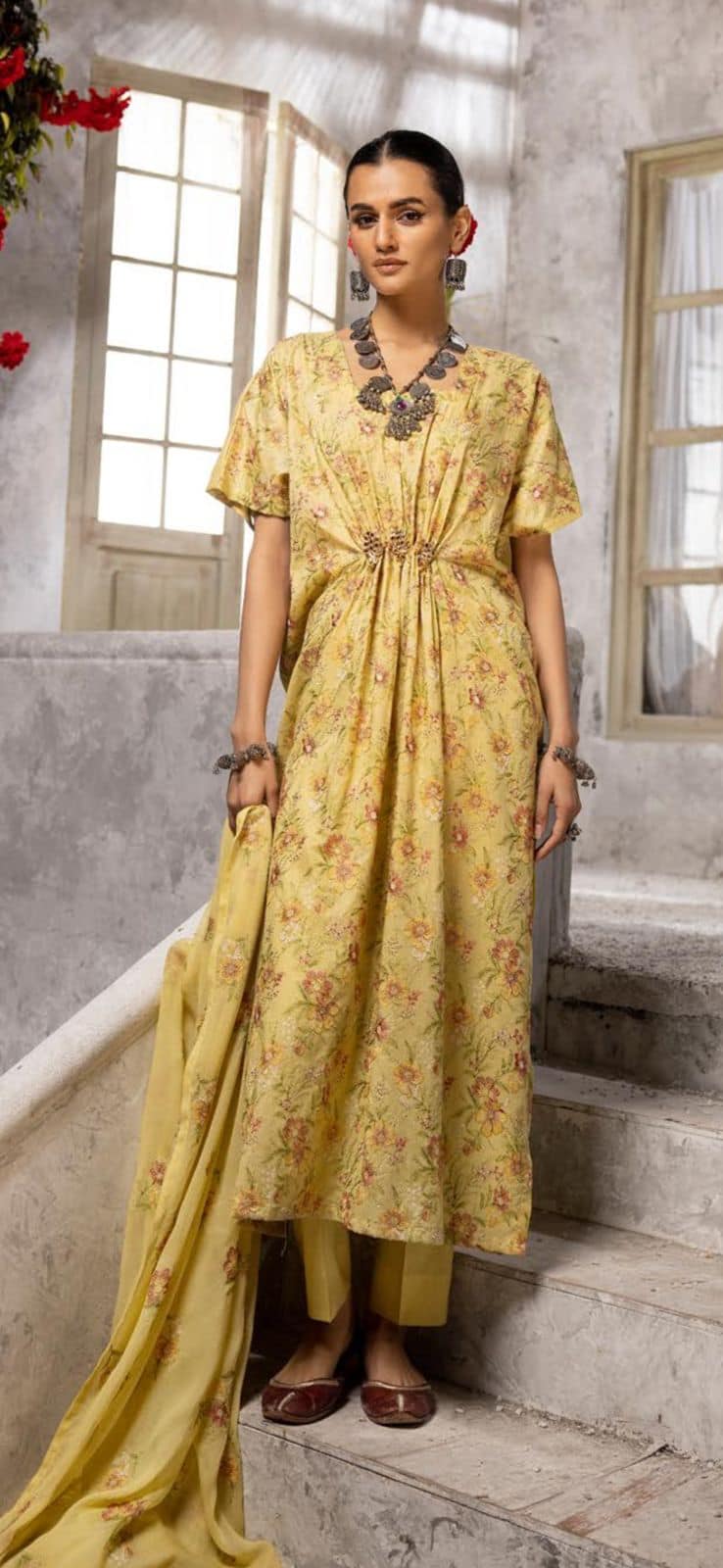 Light Yellow Olive Khoobsurat Exclusive Lawn with full body embroidery designs and Chiffon Orna